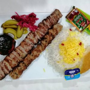 ۱سیخ کباب کوبیده گوشت مخلوط گوساله و گوسفندی ۱۰۰ گرمی،یک سیخ برگ ۲۰۰ گرمی ۴۰۰ گرم برنج ایرانی، دورچین: گوجه، زیتون، ترشی کلم قرمز
